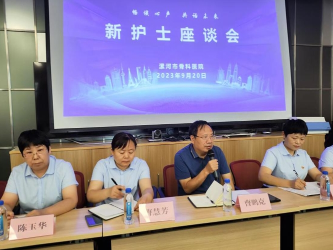 為加強醫(yī)院護理隊伍建設,了解年輕護士思想動態(tài),引導新護士成長,凝聚新生力量,切實解決他們在工作中遇到的問題和困難,近日,漯河市骨科醫(yī)院(漯河醫(yī)專二附院)護理部舉辦新護士座談會。副院長曹鵬克、護理部副主任趙春紅、曹慧芳、王爽及科室護士長代表出席會議,會議由護理部副主任王爽主持。