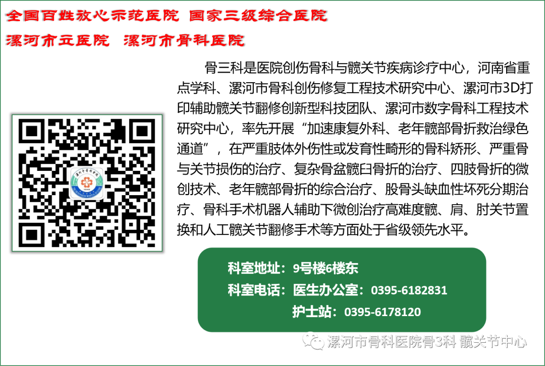 骨三科作為漯河市髖關(guān)節(jié)治療中心,90歲以上老人,占據(jù)科室住院患者1/3以上,為更好的為老年患者服務(wù),骨三科開辟了老年髖部骨折患者綠色通道,精準(zhǔn)治療,使老年髖部骨折患者快優(yōu)康復(fù),避免長期臥床,減少并發(fā)癥的發(fā)生,大大的降低了老年髖部骨折一年內(nèi)死亡率。近年來,我院出臺了諸多方便老年人就醫(yī)的服務(wù)措施,持續(xù)提升患者就醫(yī)服務(wù)體驗,以實際行動為患者送溫暖、辦實事、做好事,營造敬老愛老助老的良好氛圍。