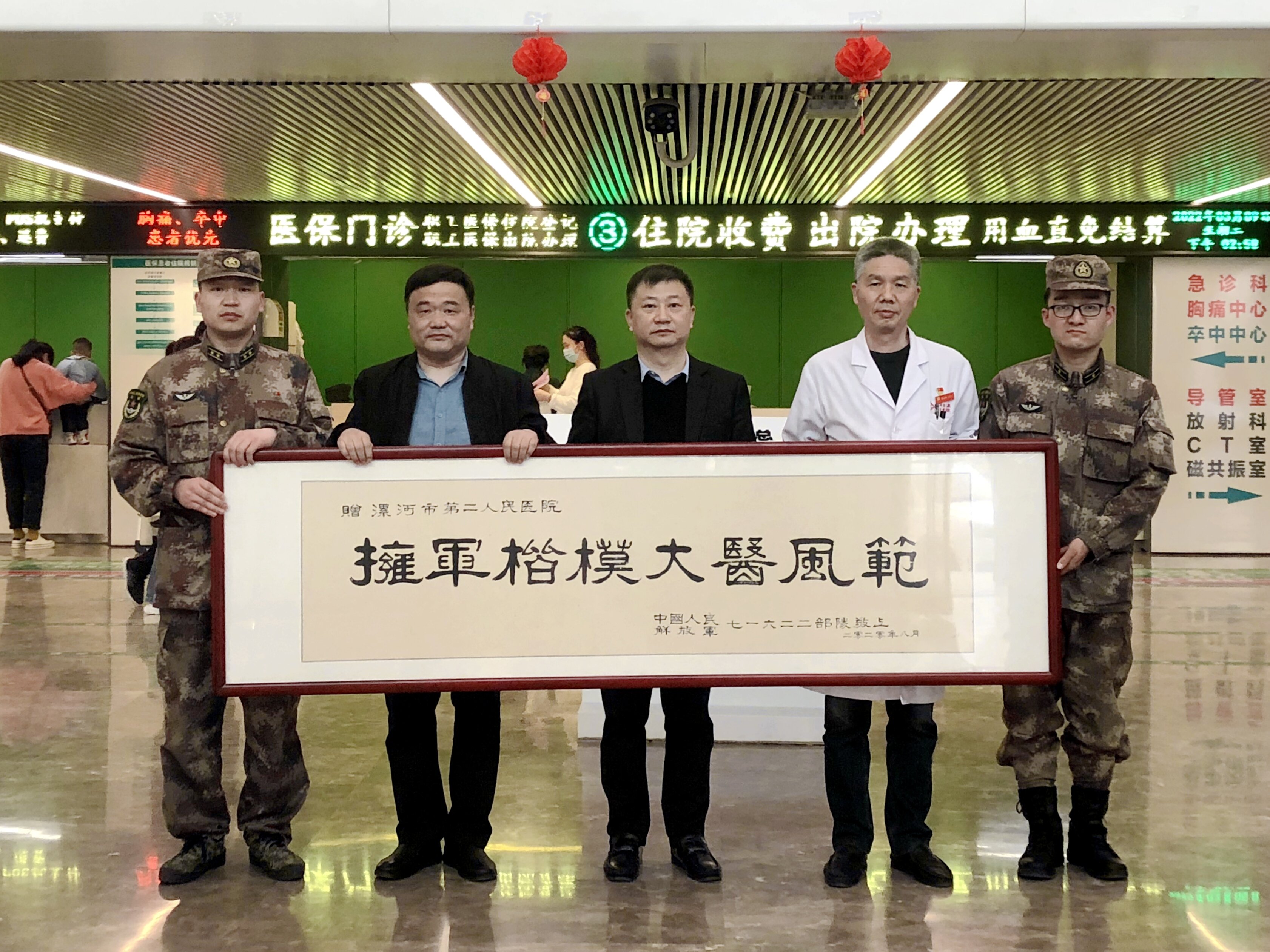 市二院對(duì)擁軍優(yōu)屬工作的高度重視,也得到了相關(guān)部門和社會(huì)的高度認(rèn)可。2023年5月,市二院被市退役軍人事務(wù)局授予“漯河市擁軍優(yōu)待合作單位”;6月,在漯河市2023年度“最美雙擁人物”“最美軍嫂”表彰儀式上,市二院劉橋和高飛分別榮獲漯河市2023年度“最美雙擁人物”、“最美軍嫂”榮譽(yù)稱號(hào)。本次再次獲評(píng)“漯河市雙擁共建示范單位”。