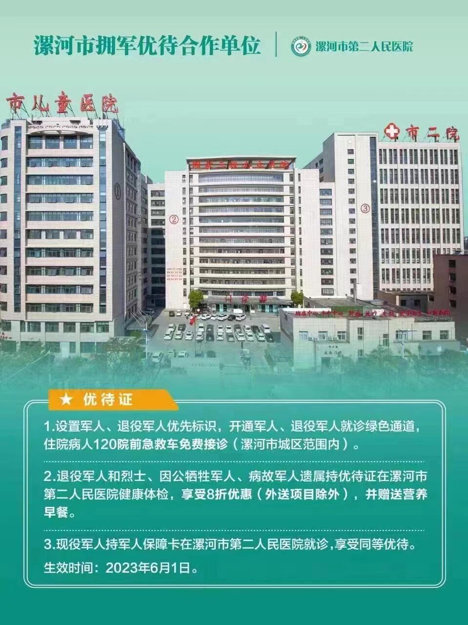為進(jìn)一步發(fā)揮在擁軍優(yōu)撫事業(yè)中的積極作用,醫(yī)院進(jìn)一步設(shè)置了軍人、退役軍人優(yōu)先標(biāo)識(shí),開通軍人、退役軍人就診綠色通道,住院病人120院前急救車免費(fèi)接診;退役軍人和烈士、因公犧牲軍人、病故軍人遺屬持優(yōu)待證在漯河市第二人民醫(yī)院健康體檢,享受8折優(yōu)惠,并贈(zèng)送營養(yǎng)早餐?,F(xiàn)役軍人持軍人保障卡在該院就診,享受同等優(yōu)待。