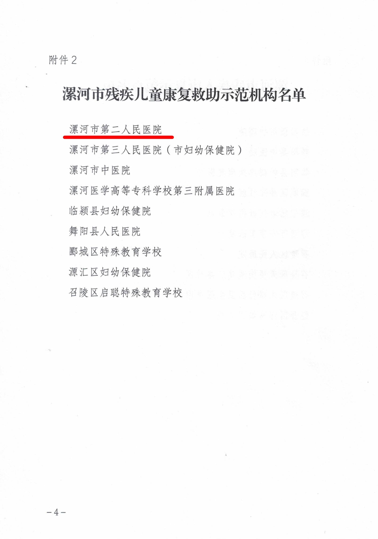 近日,漯河市第二人民醫(yī)院被漯河市殘疾人聯(lián)合會(huì)命名為市殘疾兒童康復(fù)救助示范機(jī)構(gòu)!