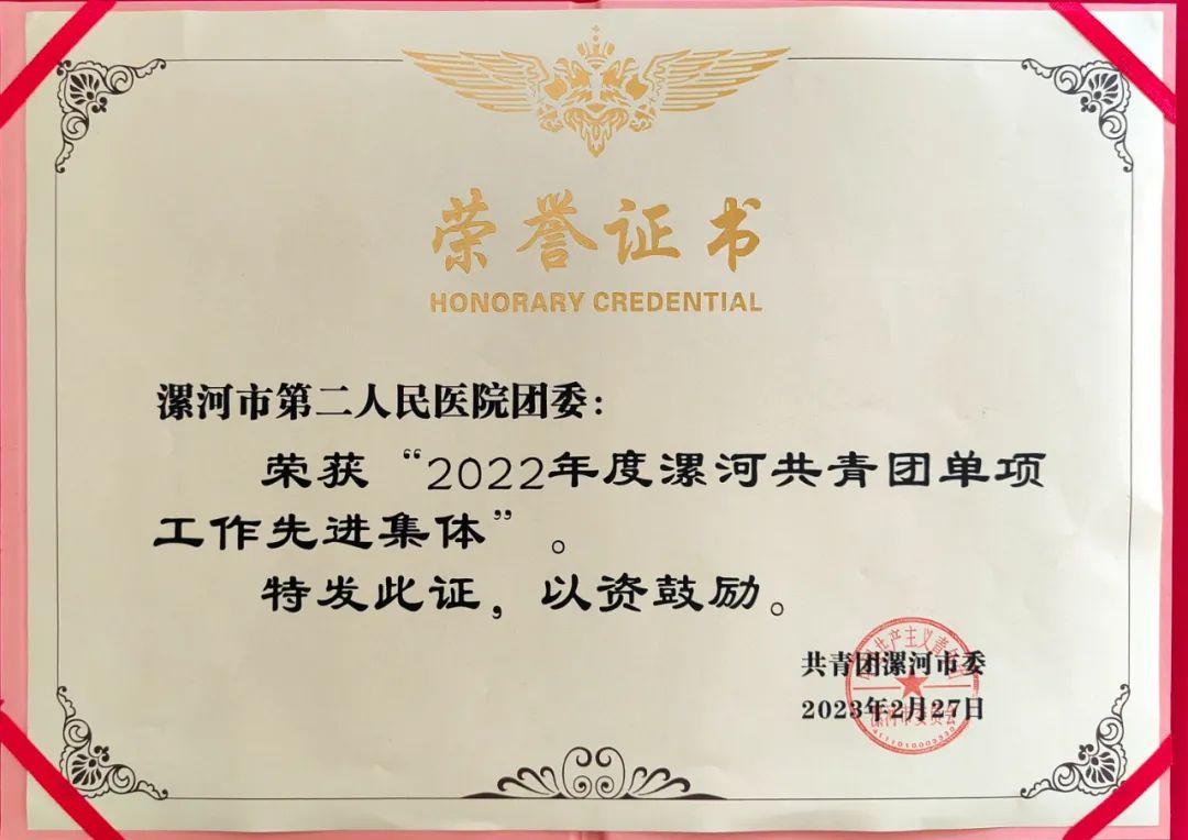 2月28日,共青團(tuán)漯河市五屆十二次全委(擴(kuò)大)會議召開,市二院團(tuán)委因志愿服務(wù)工作被表彰為“2022年度漯河共青團(tuán)單項工作先進(jìn)集體”。