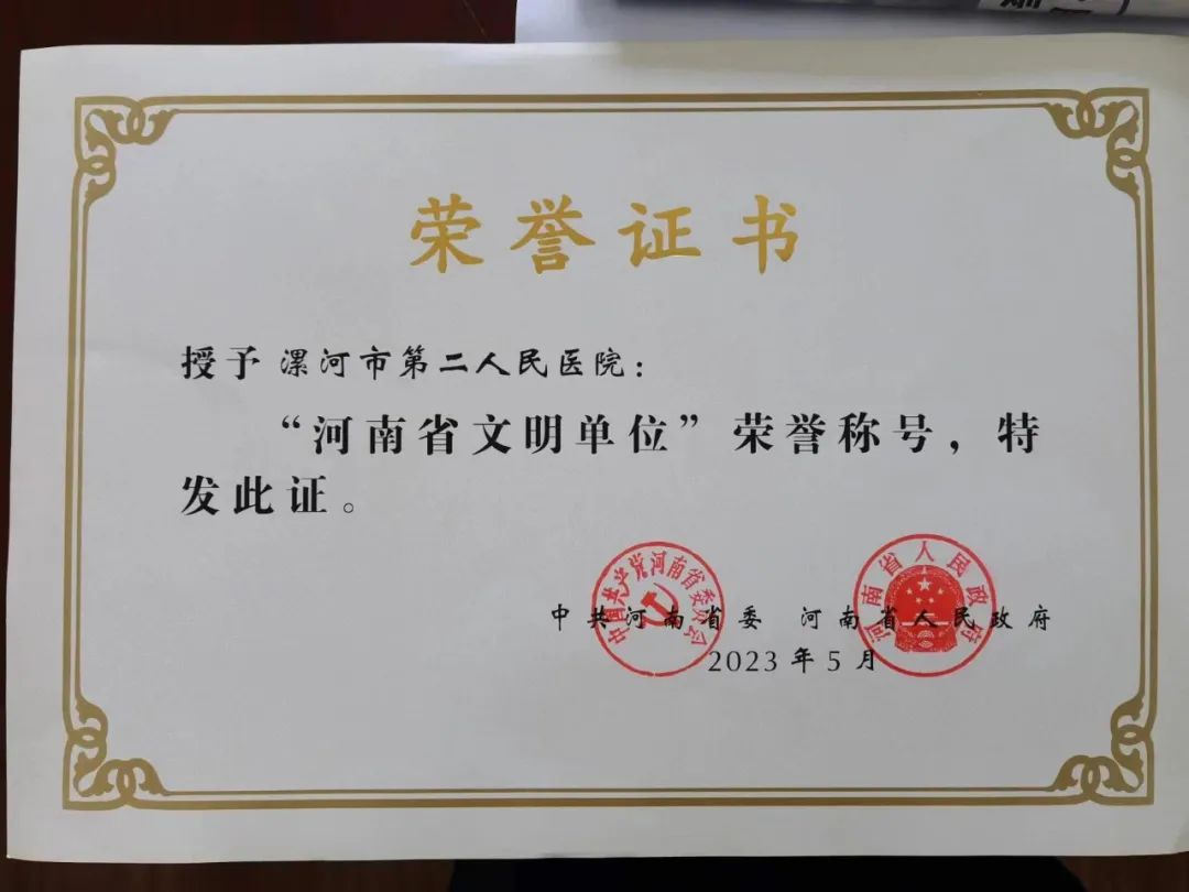 9月,中共河南省委、河南省人民政府發(fā)布《關(guān)于命名新一屆河南省文明城市文明村鎮(zhèn)文明單位文明家庭的決定》(豫文〔2023〕50號),市二院再次榮獲新一屆“河南省文明單位”榮譽(yù)稱號。