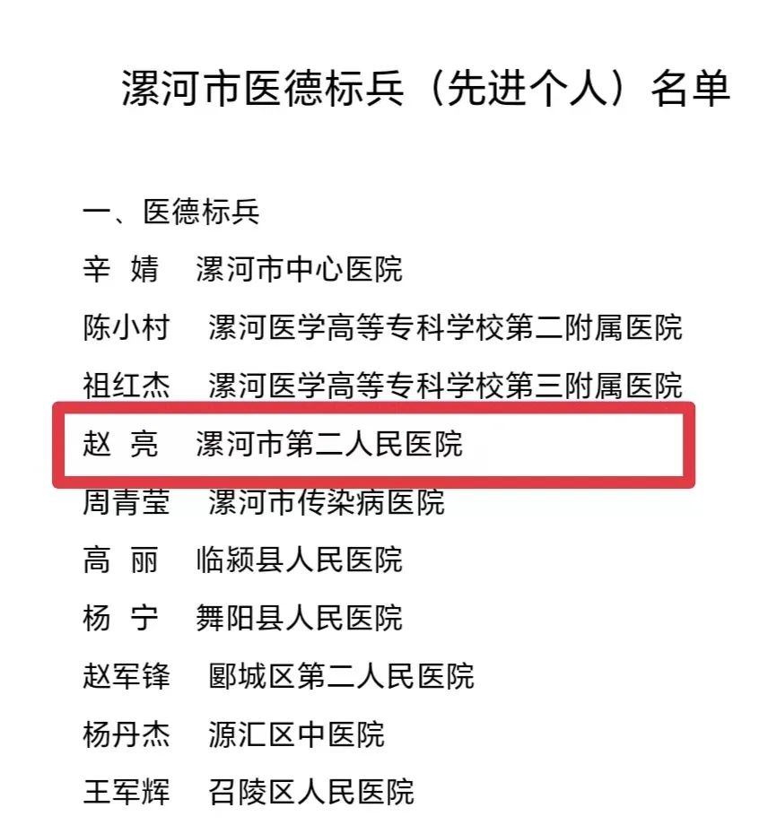 近年來,趙亮先后榮獲“漯河市五一勞動(dòng)獎(jiǎng)?wù)?rdquo;“漯河市職工職業(yè)道德建設(shè)十佳職工”“漯河市青年崗位能手”“漯河市優(yōu)秀醫(yī)師”等榮譽(yù)。一直以來他以白求恩、林巧稚為榜樣,恪守職業(yè)道德,廉潔自律,文明行醫(yī),全心全意為患者提供優(yōu)質(zhì)服務(wù),深受廣大患者尊敬和好評(píng)。