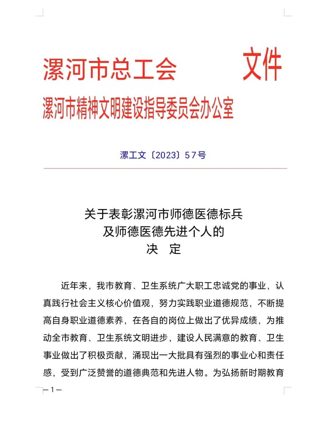 近日,漯河市總工會(huì)、漯河市精神文明建設(shè)指導(dǎo)委員會(huì)辦公室聯(lián)合發(fā)文《關(guān)于表彰漯河市師德醫(yī)德標(biāo)兵及師德醫(yī)德先進(jìn)個(gè)人的決定》,市二院放療科主任趙亮榮獲“漯河市醫(yī)德標(biāo)兵先進(jìn)個(gè)人”榮譽(yù)稱號(hào)。