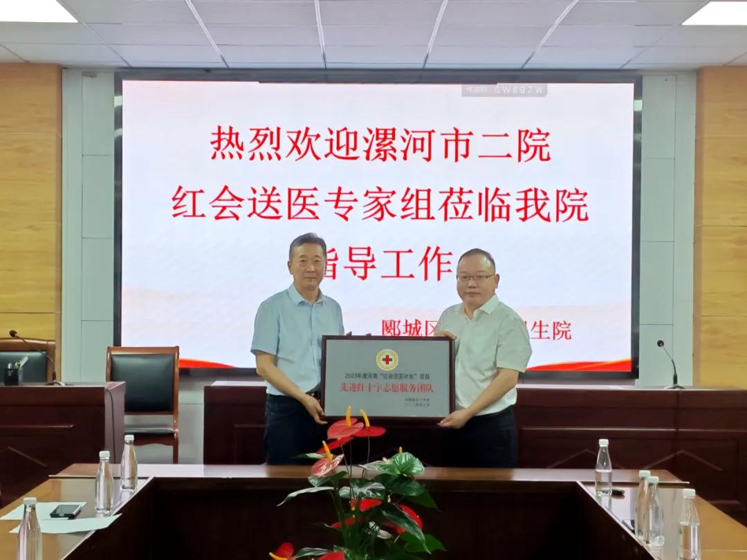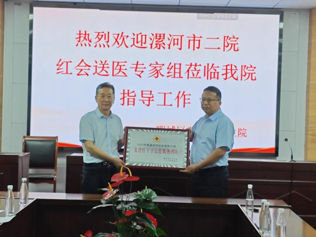 漯河市紅十字會黨組成員、副會長劉國防,市二院副院長張曉東,市二院工會主席李世學(xué),郾城區(qū)紅十字會副會長李山峰,龍城鎮(zhèn)衛(wèi)生院相關(guān)負(fù)責(zé)同志出席了本次對接會議和義診活動。對接會上,市紅會副會長劉國防對市二院“紅會送醫(yī)計劃”所做的工作表示了高度的肯定,并向醫(yī)院頒發(fā)了2023年河南省“紅會送醫(yī)計劃”先進(jìn)單位、2023年漯河市“紅會送醫(yī)計劃”先進(jìn)單位兩塊獎牌,對市二院李慧新等7名同志獲得省級和市級“優(yōu)秀紅十字醫(yī)療專家志愿者”稱號表示祝賀。