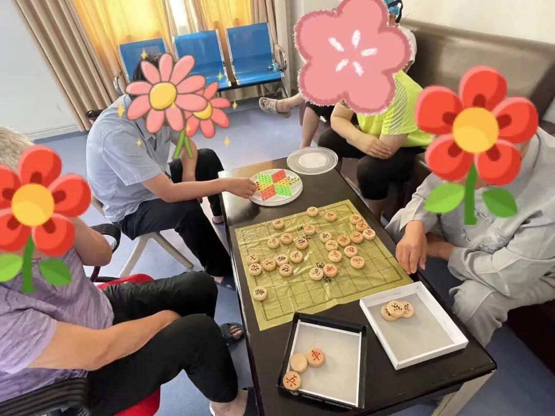 走進(jìn)活動室我們首先看到的是有的患者手中拿著筆,在信紙上認(rèn)真地傾訴著自己的內(nèi)心世界,意為發(fā)泄,也是與自己的一次和解。有的患者則在醫(yī)務(wù)人員的指導(dǎo)下,制作手工藝品,從一開始的笨拙生疏,到漸漸的熟練流暢,他們的作品從無到有,從簡到繁,無不展現(xiàn)出獨特的創(chuàng)意和個性。更有兩兩對坐的患者在棋局上戰(zhàn)得酣暢淋漓,快意人生。對于愛運動的患者,我們工娛護(hù)士則跟著視頻課程帶領(lǐng)大家揮灑汗水,恣意瀟灑。