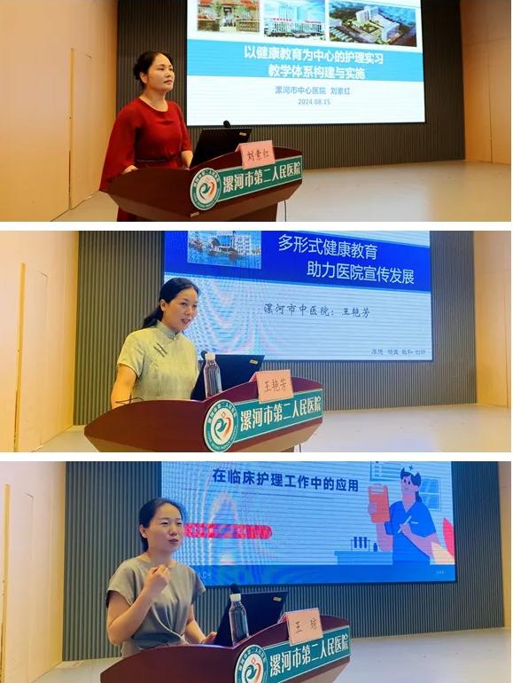 學(xué)術(shù)交流會上,來自全市各級醫(yī)療機(jī)構(gòu)的護(hù)理健康教育專家們齊聚一堂,結(jié)合自身的實踐經(jīng)驗和研究成果,共同探討護(hù)理健康教育的新理念、新方法、新技術(shù)。市中心醫(yī)院護(hù)理部副主任劉素紅講解了《以健康教育為中心的護(hù)理實習(xí)教學(xué)體系構(gòu)建與實施》,分享醫(yī)院在護(hù)理實習(xí)教學(xué)中以健康教育為中心開展帶教的亮點、實踐經(jīng)驗和對未來的展望;市中醫(yī)院呼吸消化科護(hù)士長王艷芳講解了《多形式健康教育助力醫(yī)院宣傳發(fā)展》,分享醫(yī)院開展健康教育項目的具體實施和取得的成效;市醫(yī)專二附院中醫(yī)骨傷科護(hù)士長王瓊講解了《健康宣教在臨床護(hù)理工作中的應(yīng)用》,通過了解健康教育的方式方法談到如何把健康教育落到實處;市六院護(hù)理部副主任崔臻講解了《創(chuàng)新理念與健康教育》,通過對傳統(tǒng)健康教育模式的反思談到創(chuàng)新理念在健康教育中的應(yīng)用;市二院護(hù)理部主任高凱霞講解了《家庭病床醫(yī)護(hù)團(tuán)隊如何進(jìn)行健康教育實踐活動》,通過案例展示如何開展健康教育;市二院普外科護(hù)士長王書霞、神經(jīng)內(nèi)科護(hù)士長徐曉爽分別講解了《腫瘤患者吃-動-心平衡健康管理》《護(hù)理健康教育的發(fā)展與臨床實踐》,運用實例、典故等強(qiáng)調(diào)健康教育的必要性和重要性,展示了臨床工作中取得的成果。