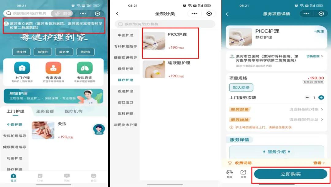 1.微信公眾號搜索“漯河市立醫(yī)院”,進入公眾號點擊“微服務”,選擇“豫健護理到家”。