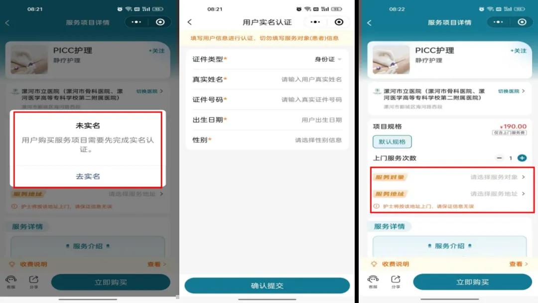 3.購買之后需實名認證,請正確填寫各項信息,服務對象填寫的是需要被護理的患者,地址填寫準確。