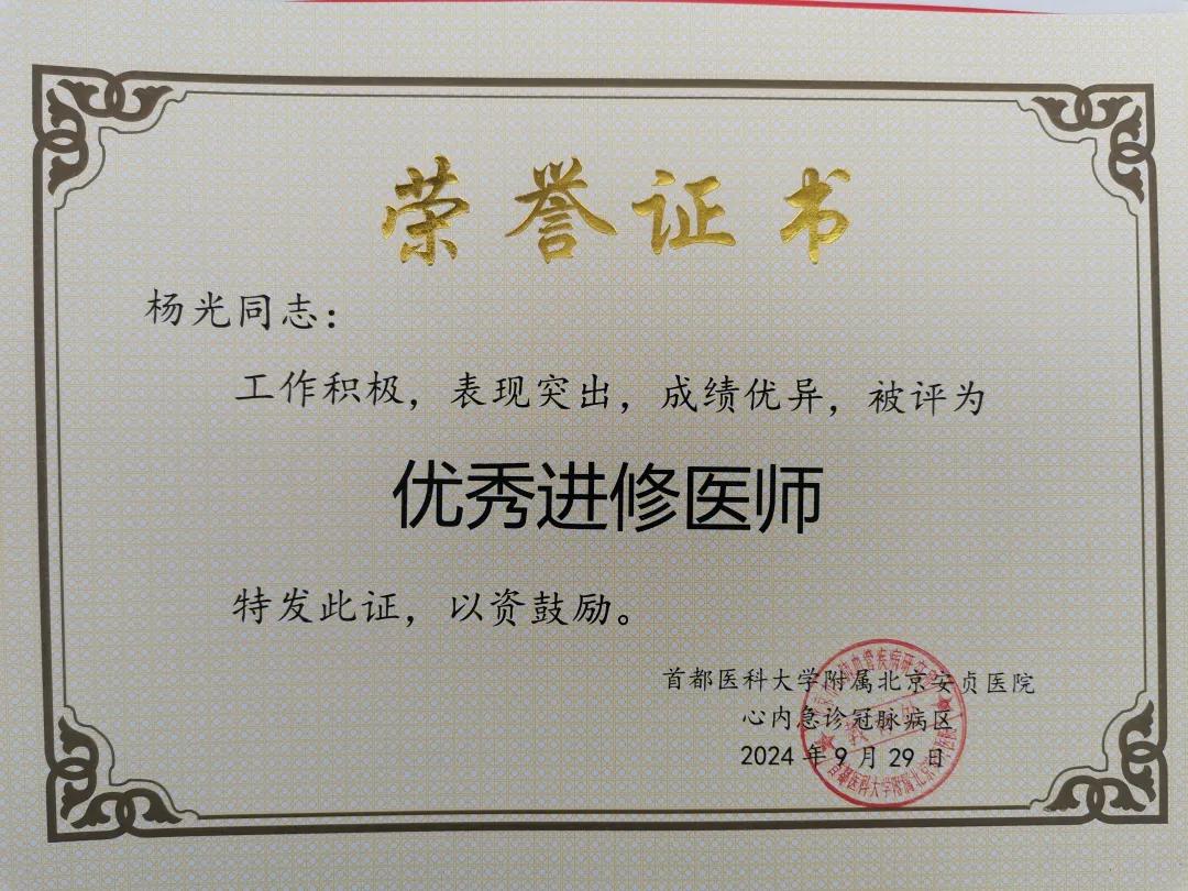 近日,市二院心血管內(nèi)科主治醫(yī)師楊光在首都醫(yī)科大學(xué)附屬北京安貞醫(yī)院完成為期一年的進(jìn)修學(xué)習(xí),現(xiàn)順利結(jié)業(yè)、學(xué)成歸來(lái),因在進(jìn)修期間表現(xiàn)優(yōu)異,被評(píng)為北京安貞醫(yī)院“優(yōu)秀進(jìn)修醫(yī)師”榮譽(yù)稱號(hào),不僅為醫(yī)院全體青年醫(yī)師樹(shù)立了榜樣,同時(shí)也給醫(yī)院心內(nèi)科專業(yè)發(fā)展注入新的活力,將所學(xué)轉(zhuǎn)化為生產(chǎn)力,把新知識(shí)、新技術(shù)傳播開(kāi)來(lái),讓更多患者受益。