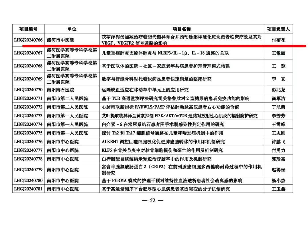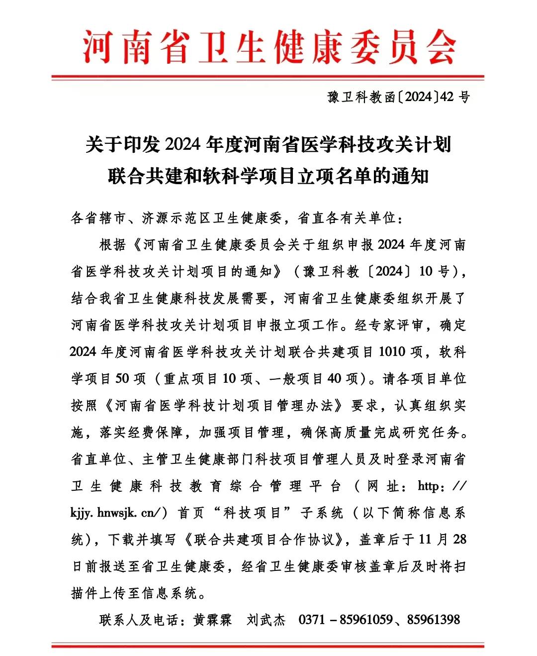 近日,河南省衛(wèi)健委發(fā)布了《關于印發(fā)2024年度河南省醫(yī)學科技攻關計劃聯(lián)合共建和軟科學項目立項名單的通知》,漯河市中醫(yī)院作為主持單位,共有1個項目獲得立項,此次為醫(yī)院在該類項目申報中首次獲得立項,這是繼醫(yī)院博士創(chuàng)新實踐基地獲批以來,科技研發(fā)的又一新突破。