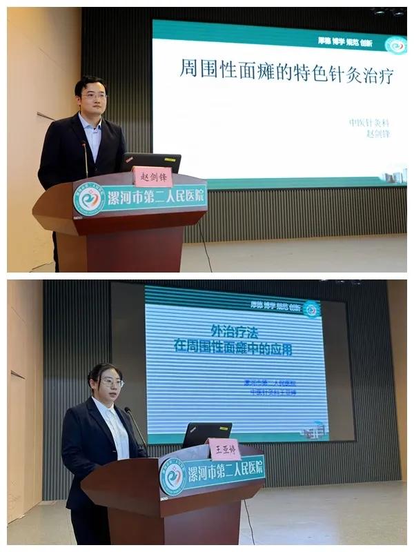 市二院中醫(yī)針灸科趙劍鋒醫(yī)師、王亞婷醫(yī)師分別分享了《周?chē)悦姘c的特色針灸治療》《外治療法在周?chē)悦姘c中的應(yīng)用》,詳細(xì)介紹了周?chē)悦姘c的外治療法。