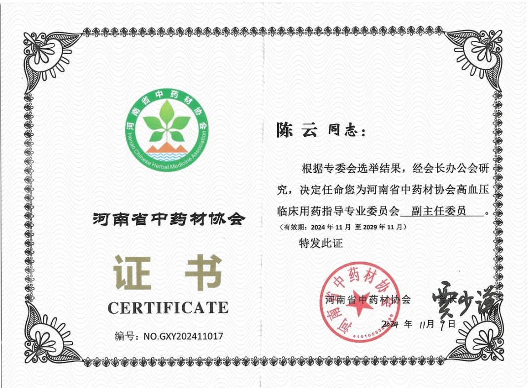11月8日-11月9日,由河南省中西醫(yī)結(jié)合醫(yī)院、河南省高血壓中西醫(yī)結(jié)合診療中心承辦的國家繼續(xù)教育項目“難治性高血壓中西醫(yī)結(jié)合綜合防治培訓(xùn)班”、河南省繼續(xù)教育項目“中西醫(yī)結(jié)合治療難治性高血壓適宜技術(shù)培訓(xùn)班”暨河南省中藥材協(xié)會高血壓臨床用藥指導(dǎo)專業(yè)委員會成立大會在河南鄭州順利召開。會上,漯河市中醫(yī)院心病科副主任陳云被評選為河南省中藥材協(xié)會高血壓臨床用藥指導(dǎo)專業(yè)委員會副主任委員。