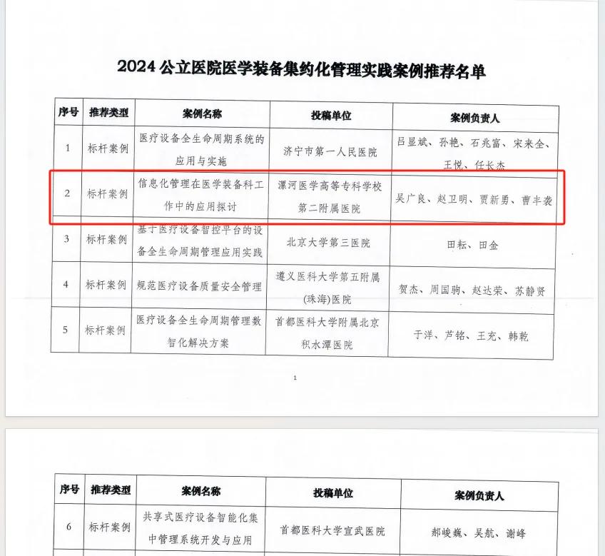 其中我院醫(yī)學(xué)裝備集約化管理案例《信息化管理在醫(yī)學(xué)裝備科工作中的應(yīng)用探討》經(jīng)過激烈角逐,最終與首都醫(yī)科大學(xué)附屬北京積水潭醫(yī)院、北京大學(xué)第三醫(yī)院、首都醫(yī)科大學(xué)宣武醫(yī)院、濟寧市第一人民醫(yī)院、遵義醫(yī)科大學(xué)第五附屬醫(yī)院在“標(biāo)桿案例”板塊中脫穎而出,成功入選全國公立醫(yī)院醫(yī)學(xué)裝備集約化管理實踐案例“標(biāo)桿案例”推薦。是全省唯一入選的標(biāo)桿案例,也是我院醫(yī)學(xué)裝備管理工作首次榮獲國家級殊榮!