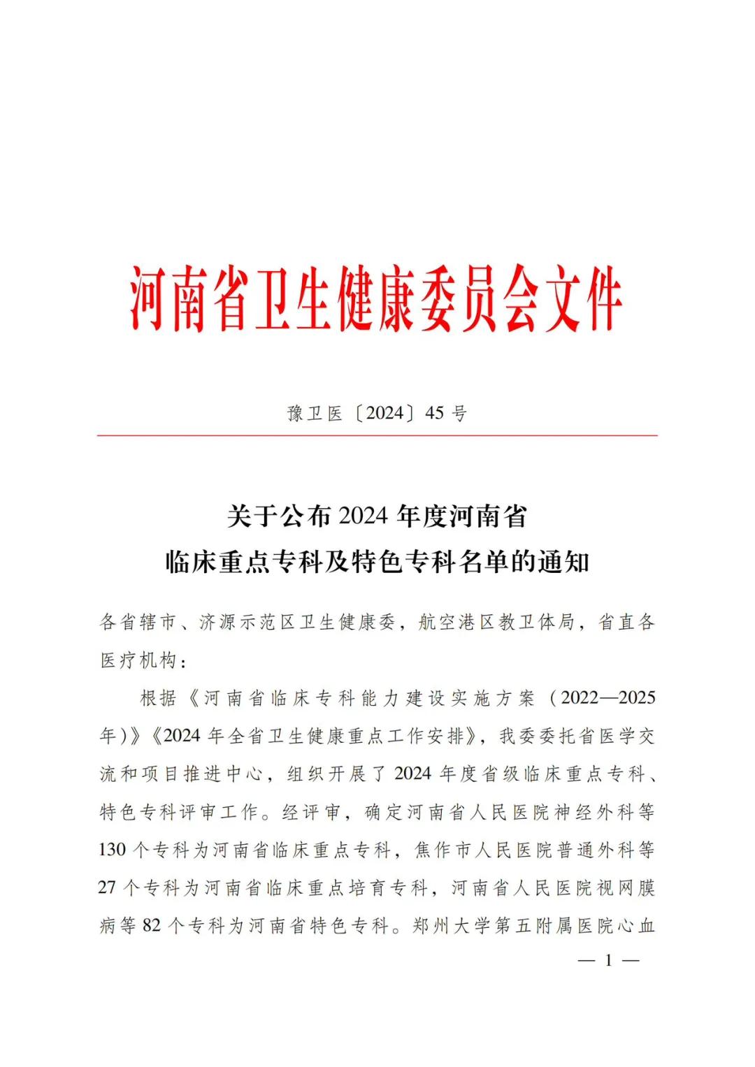12月24日,河南省衛(wèi)生健康委下發(fā)了《關(guān)于公布2024年度河南省臨床重點(diǎn)專(zhuān)科及特色專(zhuān)科名單的通知》(豫衛(wèi)醫(yī)〔2024〕45號(hào))。市二院兒科、腫瘤科(腫瘤放療科、腫瘤內(nèi)科)、康復(fù)醫(yī)學(xué)科成功通過(guò)評(píng)審,被確定為河南省臨床重點(diǎn)培育專(zhuān)科。