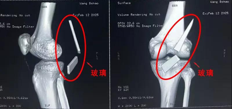 患者家屬這才開始意識到問題的嚴重性,便帶著孩子到鄉(xiāng)鎮(zhèn)衛(wèi)生院檢查——結果顯示右膝關節(jié)后方竟然殘留著兩塊兒鋒利的碎玻璃,測量后預估玻璃總長將近13厘米!