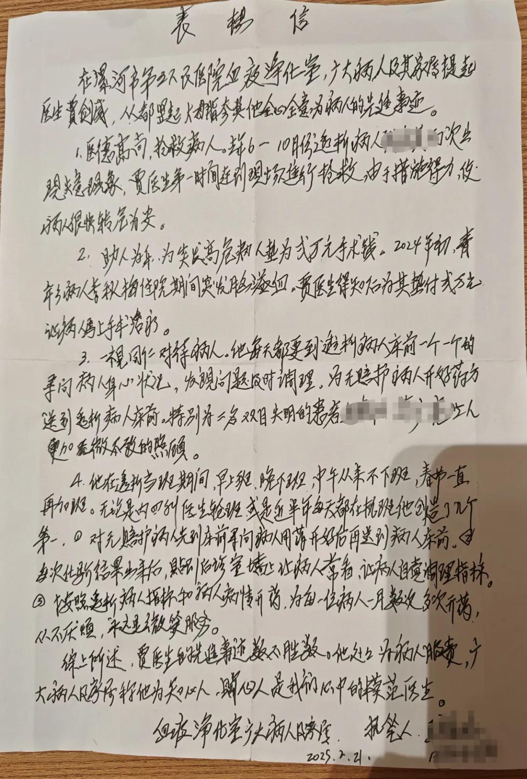 “他處處為病人服務,廣大病人及家屬稱他為知心人、貼心人,是我們心中的模范醫(yī)生......”信箋上,溫暖的字句自然流淌,言語間都是對賈劍威醫(yī)生的信任與感激。