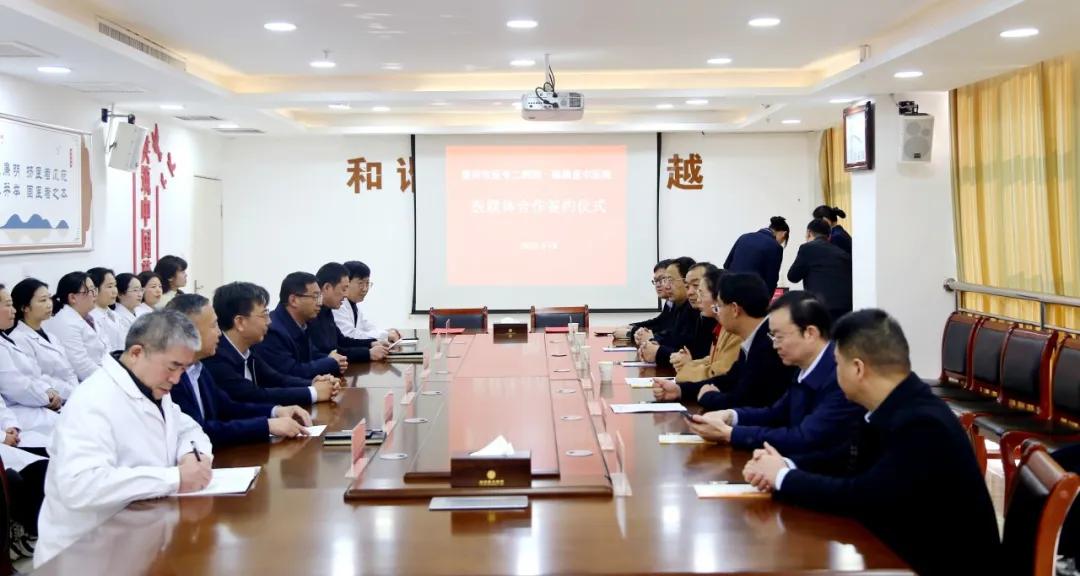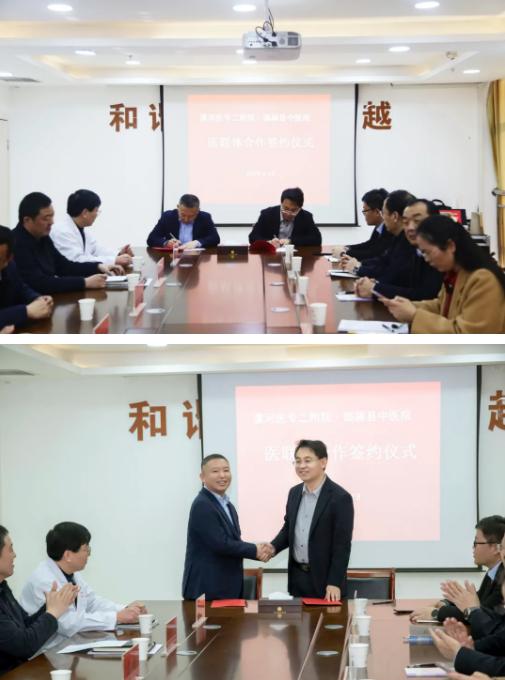 漯河醫(yī)專二附院黨委書記柴運洪與臨潁縣中醫(yī)院黨委書記田學民分別代表雙方簽訂合作協(xié)議。