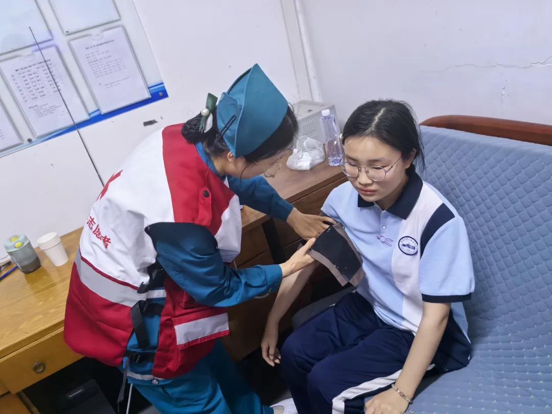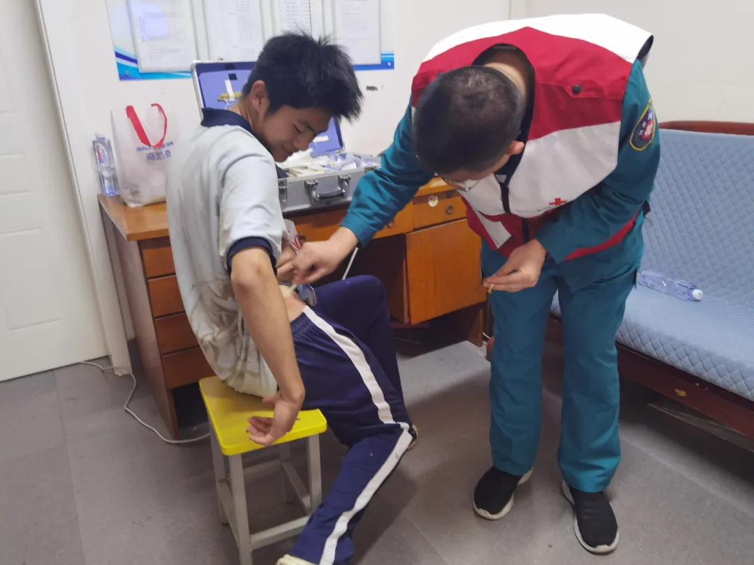 運(yùn)動會期間,志愿者穿梭于賽場的各個角落,化身“移動急救站”,時刻關(guān)注著運(yùn)動員的狀態(tài)。一旦接到求助,他們迅速到達(dá)現(xiàn)場,對傷員進(jìn)行初步診斷和處理,為擦傷運(yùn)動員細(xì)心消毒包扎,為身體不適學(xué)生及時測量血壓、補(bǔ)充電解質(zhì)飲品。面對突發(fā)扭傷學(xué)生,志愿者第一時間進(jìn)行專業(yè)評估與固定處理,贏得師生一致好評。