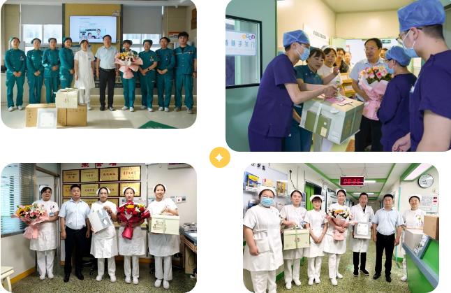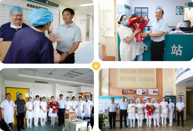 5月12日上午,院黨委書記柴運(yùn)洪、院長(zhǎng)王齊超等領(lǐng)導(dǎo)班子來(lái)到各科室、各病區(qū),為護(hù)理工作者送上精心準(zhǔn)備的鮮花、蛋糕和慰問(wèn)品。院領(lǐng)導(dǎo)與護(hù)理人員親切交流,關(guān)懷大家的工作和生活情況, 高度贊揚(yáng)了大家“堅(jiān)守崗位,以過(guò)硬本領(lǐng)和作風(fēng),積極投身醫(yī)院高質(zhì)量發(fā)展新征程,真心護(hù)佑人民群眾健康”的初心、實(shí)踐。