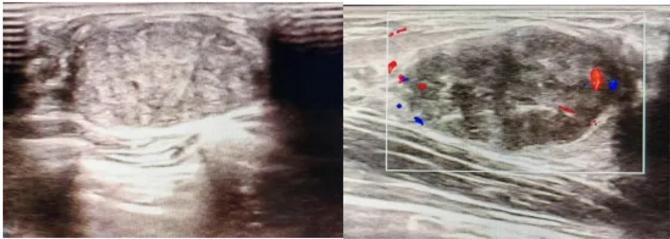 形態(tài)不規(guī)則,邊界模糊,內(nèi)部回聲不均,可見微鈣化。
