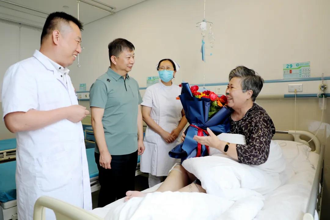 5月30日上午,市二院黨委書記魏松、副院長劉橋?qū)3虂淼讲》?,看望慰問這位康復(fù)中的香港同胞,送上代表健康祝愿的鮮花,關(guān)切詢問其身體恢復(fù)情況,并送上端午安康的祝福。“沒想到在異鄉(xiāng)生病,還能在節(jié)日收到這么溫暖的關(guān)懷,真的太感謝大家了!是二院優(yōu)秀的醫(yī)護(hù)團(tuán)隊(duì)救了我的命,我們?nèi)叶几屑げ槐M!感謝二院!感謝漯河!”翁阿姨激動(dòng)地表示,醫(yī)院高效的救治與貼心的服務(wù),讓他感受到了重生的喜悅和家一般的溫暖。