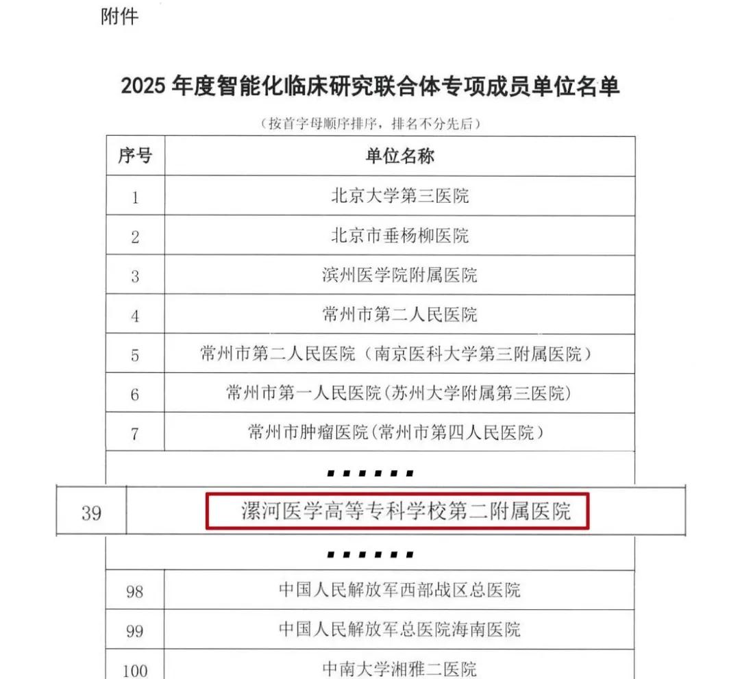 由國(guó)家骨科與運(yùn)動(dòng)康復(fù)臨床醫(yī)學(xué)研究中心(以下簡(jiǎn)稱“國(guó)家臨床中心”)聯(lián)合國(guó)家藥品監(jiān)督管理局信息中心、國(guó)家臨床中心產(chǎn)業(yè)創(chuàng)新中心(常州)共同設(shè)立的“2025年度智能化臨床研究聯(lián)合體專項(xiàng)”已完成首批成員單位遴選,共103家單位成功入選(具體名單見文末附件),覆蓋全國(guó)26個(gè)省份。 其中漯河醫(yī)專二附院成功入選國(guó)家臨床中心“智能化臨床研究聯(lián)合體專項(xiàng)”首批成員單位