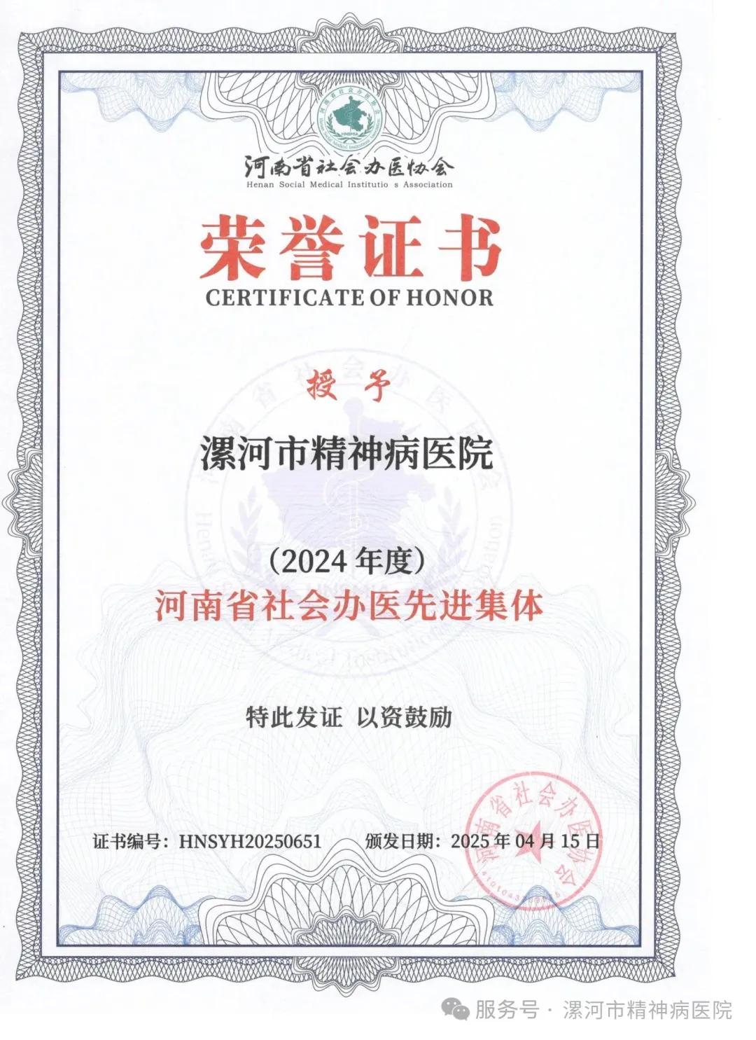 漯河市精神病醫(yī)院榮獲“河南省社會辦醫(yī)先進集體”榮譽稱號