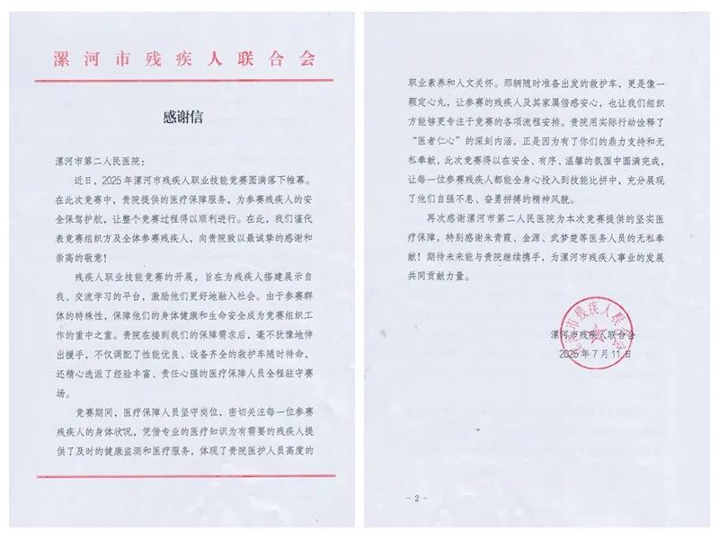 近日,市二院收到一封來(lái)自市殘聯(lián)發(fā)來(lái)的感謝信。信中高度贊譽(yù)醫(yī)院在2025年全市殘疾人職業(yè)技能競(jìng)賽期間提供的全方位醫(yī)療保障服務(wù),稱其“用實(shí)際行動(dòng)詮釋醫(yī)者仁心,為賽事筑起堅(jiān)實(shí)的安全防線。”