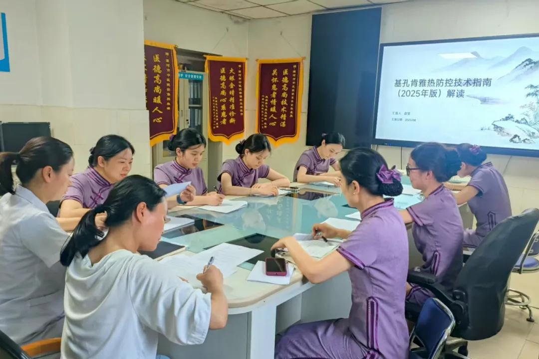 培訓(xùn)中,趙瑩從多個(gè)維度對(duì)基孔肯雅熱進(jìn)行了詳細(xì)講解:了解該疾病的病原學(xué)特征、流行病學(xué)特點(diǎn)、臨床表現(xiàn)和診斷標(biāo)準(zhǔn),重點(diǎn)強(qiáng)調(diào)了通過(guò)白紋伊蚊、埃及伊蚊叮咬傳播的途徑,以及發(fā)熱、關(guān)節(jié)痛和皮疹等典型癥狀的識(shí)別要點(diǎn)。并系統(tǒng)培訓(xùn)了針對(duì)發(fā)熱患者的預(yù)檢分診流程、疑似病例的規(guī)范處置方法以及職業(yè)防護(hù)措施,確保每位工作人員都能熟練掌握。