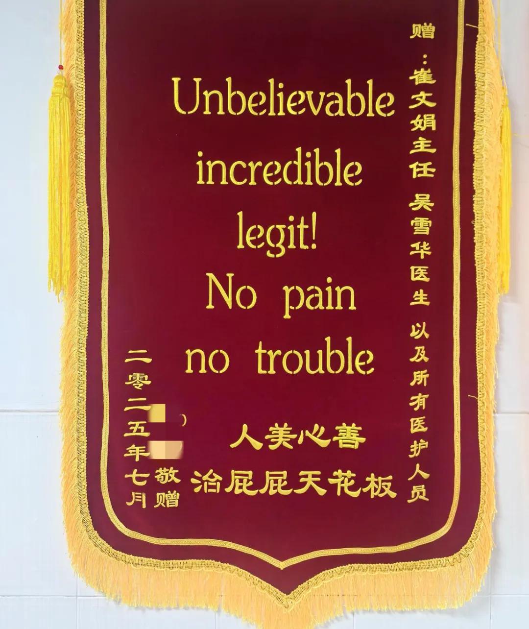 熟悉肛腸科的人都知道,這里時(shí)常因患者的 “巧思” 充滿歡樂(lè),近期科室就接連收到了好幾面別具一格的錦旗。其中一面寫(xiě)著 “Unbelievable incredible legit!No pain no trouble 人美心善 治屁屁天花板”,中西結(jié)合的表達(dá)既俏皮又真誠(chéng);還有一面則用 “手術(shù)不疼換藥不疼,肛好有你高水平!” 的諧音巧語(yǔ)傳遞謝意。這些充滿趣味的錦旗文字,從側(cè)面印證了肛腸科在創(chuàng)面疼痛管理方面取得了良好成效,也是患者對(duì)我們?cè)\療服務(wù)的肯定認(rèn)可。