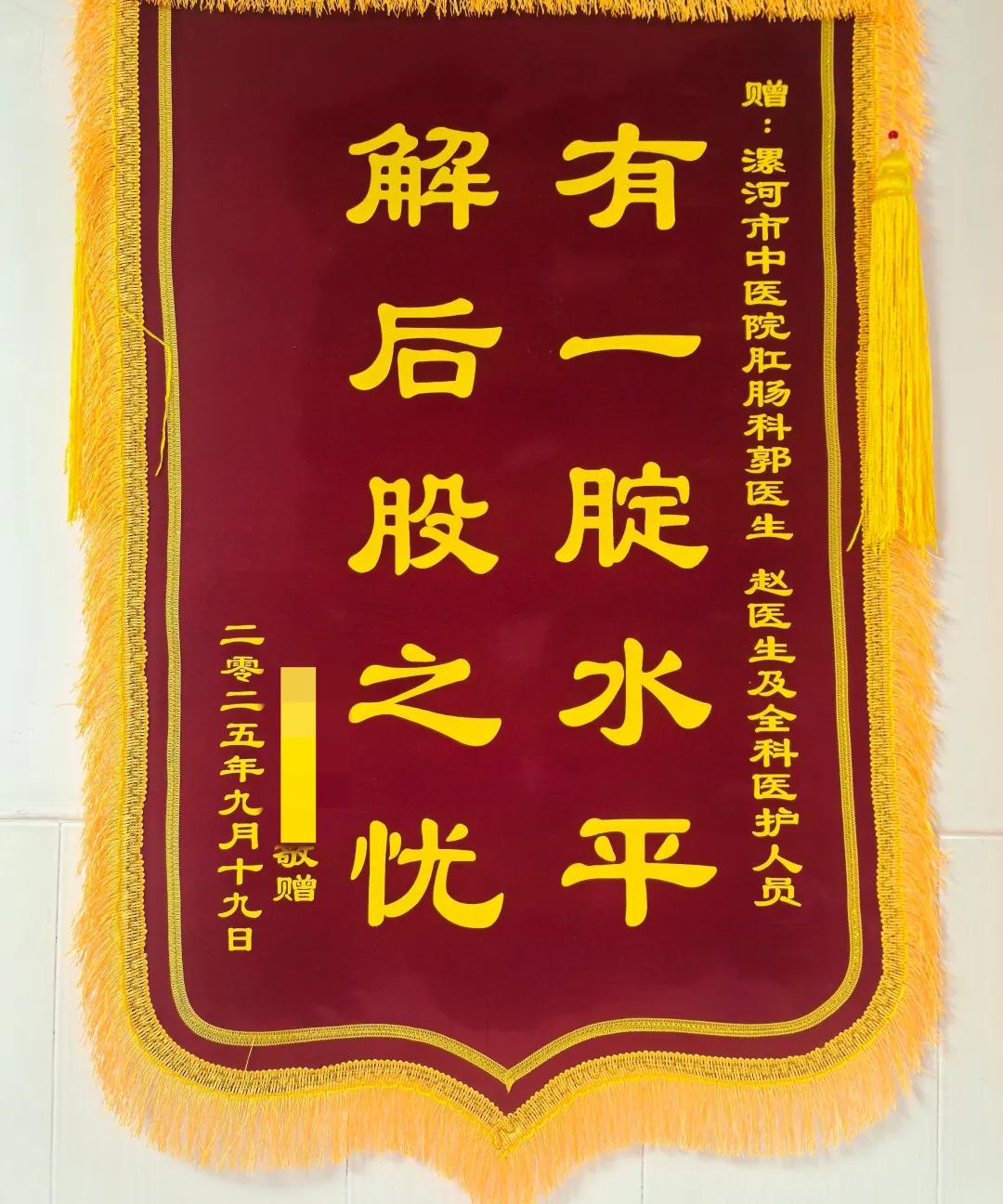 近日,一位肛周膿腫術(shù)后復(fù)查的患者,特意冒雨從外地趕來(lái),將一面寫(xiě)著 “有一腚水平,解后股之憂” 的錦旗送到科室。此前,該患者因肛周膿腫飽受疼痛折磨,輾轉(zhuǎn)多家醫(yī)院仍未找到滿意的治療方案,最終選擇了漯河市中醫(yī)院肛腸科。在劉兵主任、崔文娟副主任、郭松楊主治醫(yī)師、趙蕊住院醫(yī)師及全體醫(yī)護(hù)人員的共同努力下,經(jīng)精心治療與護(hù)理,患者術(shù)中術(shù)后無(wú)明顯疼痛,就醫(yī)體驗(yàn)舒心,幾日前已順利痊愈出院。
