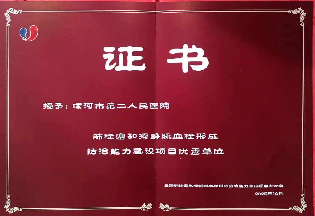 漯河市二院獲評“全國肺栓塞和深靜脈血栓形成防治能力建設項目優(yōu)秀單位”