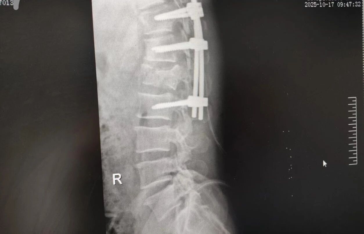 針對(duì)腰椎傷情,骨科竇志剛醫(yī)生團(tuán)隊(duì)緊急開展腰 1 椎體爆裂性骨折切開復(fù)位內(nèi)固定術(shù) + 椎板切除減壓術(shù)。手術(shù)室、麻醉科無(wú)縫銜接開通綠色通道,手術(shù)團(tuán)隊(duì)快速就位,術(shù)后患者下肢活動(dòng)恢復(fù)自如。
