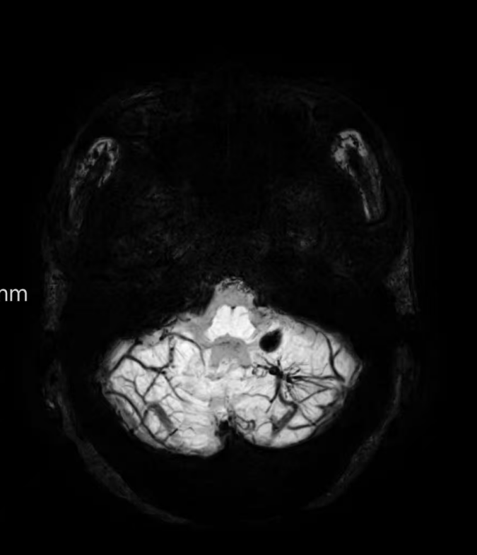我們大腦里密密麻麻的靜脈血管,在常規(guī)影像上是“灰蒙蒙”的一片。但SWI對脫氧血液極其敏感,能將靜脈血管清晰地顯示為黑色的細線。這個本領(lǐng)非常有用: