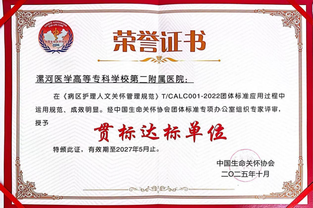 10月30日—11月2日,由國家生命關(guān)懷協(xié)會主辦、華中科技大學(xué)同濟(jì)醫(yī)學(xué)院附屬協(xié)和醫(yī)院承辦的國家級繼續(xù)教育項(xiàng)目“醫(yī)院護(hù)理人文關(guān)懷標(biāo)準(zhǔn)化建設(shè)”會議在武漢召開。此次大會以“關(guān)懷實(shí)踐 標(biāo)準(zhǔn)引領(lǐng)”為主題,匯聚了來自29個?。ㄊ小⒆灾螀^(qū))的護(hù)理界領(lǐng)導(dǎo)與專家,共同探討與展示醫(yī)學(xué)人文關(guān)懷標(biāo)準(zhǔn)化建設(shè)的前沿理論與實(shí)踐成果。在備受矚目的授牌儀式環(huán)節(jié),大會正式公布了《病區(qū)護(hù)理人文關(guān)懷管理規(guī)范》團(tuán)體標(biāo)準(zhǔn)第二批貫標(biāo)驗(yàn)收評審結(jié)果,并現(xiàn)場為達(dá)標(biāo)單位授牌、頒發(fā)證書。漯河醫(yī)專二附院(漯河市骨科醫(yī)院、漯河市立醫(yī)院)憑借在人文護(hù)理領(lǐng)域扎實(shí)的工作成效和卓越的服務(wù)水平,成功通過評審,被正式授予“《病區(qū)護(hù)理人文關(guān)懷管理規(guī)范》團(tuán)體標(biāo)準(zhǔn)貫標(biāo)達(dá)標(biāo)單位”。