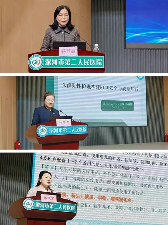 學(xué)術(shù)交流環(huán)節(jié),市中心醫(yī)院NICU護(hù)士長楊青麗以《新生兒低血糖臨床規(guī)范管理專家共識》(2021)為題,系統(tǒng)闡述了新生兒低血糖的“預(yù)防、篩查、干預(yù)、隨訪”四個重點(diǎn);市二院護(hù)理部副主任孫麗霞分享了《以預(yù)見性護(hù)理構(gòu)建NICU安全與質(zhì)量基石》,點(diǎn)明預(yù)見性護(hù)理是NICU生命安全保障的基石,也是質(zhì)量持續(xù)提升的第一道防線;市二院感控辦副主任韓艷軍以《新生兒病區(qū)醫(yī)院感染預(yù)防與控制標(biāo)準(zhǔn)》進(jìn)行了交流,闡明要嚴(yán)守感控標(biāo)準(zhǔn),筑牢安全防線,保障每一位新生兒的健康與安全;市婦幼保健院兒科護(hù)士長鄭文韜以《高危兒靜脈通路的合理選擇》展開,講解了高危兒靜脈通路的選擇,核心在于基于個體評估,實現(xiàn)安全與療效的最佳平衡;市二院靜療??谱o(hù)士李艷結(jié)合《兒童靜療常見并發(fā)癥的預(yù)防及處理》,提出兒童靜療安全,核心在于以預(yù)防為首;市二院傷口造口??谱o(hù)士馬美華分享了《兒童常見皮膚護(hù)理與管理》,闡述嚴(yán)守預(yù)防底線,踐行精細(xì)照護(hù),是守護(hù)新生兒稚嫩肌膚、避免醫(yī)源性皮膚損傷的根本之道。