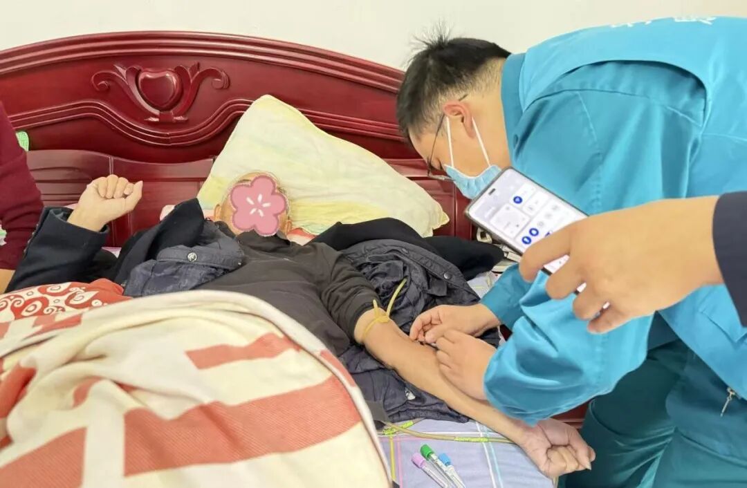 76歲的老人在外地接受膽管癌手術(shù)后返家休養(yǎng),身上仍攜帶兩根術(shù)區(qū)引流管。11月12日早上,家屬突然發(fā)現(xiàn)引流液呈血性,并緊急與主管醫(yī)生溝通后,醫(yī)生建議立即進(jìn)行血常規(guī)和凝血功能檢測,明確病情變化??稍摶颊邉傋鐾晔中g(shù),身體虛弱,行動不便,往返醫(yī)院的路程對他來說無疑是一種煎熬,焦急的家屬只好匆匆趕往漯河醫(yī)專二附院求助。急診科醫(yī)護(hù)人員幫助家屬通過“豫健護(hù)理到家”平臺完成下單操作,經(jīng)驗(yàn)豐富的陳笑寒護(hù)士長與護(hù)士李鵬舉第一時間攜帶專業(yè)采血設(shè)備和護(hù)理包,火速趕往患者家中,緩解了患者與家屬的燃眉之急。(盧 闖 劉 旭 袁錦鈺)
