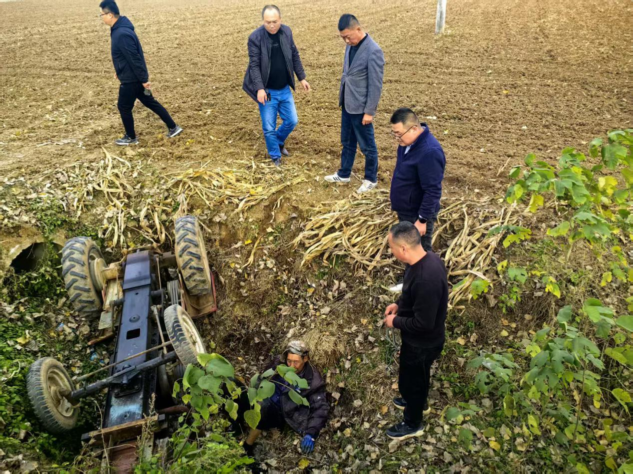 “快過(guò)來(lái),有人被拖拉機(jī)壓住了!”王行下車查看后喊道。聽(tīng)到呼喊聲,幾人立即下車,到達(dá)現(xiàn)場(chǎng)后發(fā)現(xiàn),溝里側(cè)翻著一輛拖拉機(jī),一位老人趴在溝里,他的左手手臂被拖拉機(jī)死死壓著。“王行你馬上聯(lián)系派出所和120來(lái)支援,其他人拿上繩索、木棍過(guò)來(lái)救人。”張慶林看到這一情況,立即組織在場(chǎng)人員開(kāi)展救援。現(xiàn)場(chǎng),為將老人從車底救出,六人一起用木棍將拖拉機(jī)固定,待拖拉機(jī)被抬升的一定高度后,王行立即將老人從車底抱了出來(lái)。“大爺,你是哪個(gè)村的,現(xiàn)在感覺(jué)怎么樣,家里人電話是多少呀?”谷稅興問(wèn)到,起初老人有點(diǎn)迷糊,過(guò)了幾分鐘后才慢慢緩過(guò)來(lái)。