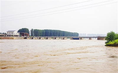 7月23日上午,記者在沙河、澧河交匯處看到,河水流速加快,水位明顯升高,河面顯得寬了不少,渾濁的河水中飄浮著大量水草。沙河節(jié)制閘處閘孔全開,正在全力泄洪,節(jié)制閘兩側南北河道的水位也已經持平(如圖)。