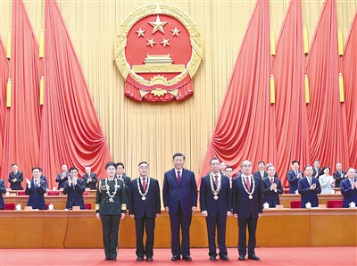 在雄壯的《向祖國(guó)英雄致敬》樂(lè)曲聲中,習(xí)近平為國(guó)家勛章和國(guó)家榮譽(yù)稱號(hào)獲得者一一頒授勛章獎(jiǎng)?wù)拢⑼麄冇H切握手、表示祝賀。隨后,4位國(guó)家勛章和國(guó)家榮譽(yù)稱號(hào)獲得者受邀到主席臺(tái)就座。全場(chǎng)響起一陣陣熱烈的掌聲。
