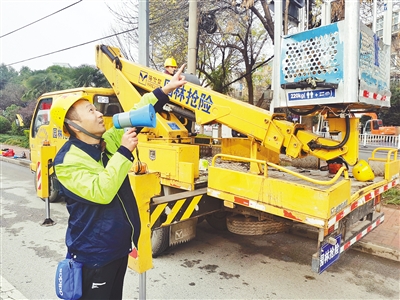 修剪工作經(jīng)常需要用到高空作業(yè)車等大型機(jī)械,為避免造成交通擁堵,王磊和同事總是在人流車流量小時開始工作。“修剪工作需要早上班、晚下班、深夜再加一趟班。”王磊笑呵呵地說。