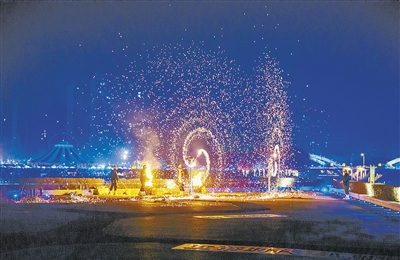 2月11日晚,在紅楓廣場(chǎng),鐵花如煙花般綻放。記者 楊 光 攝