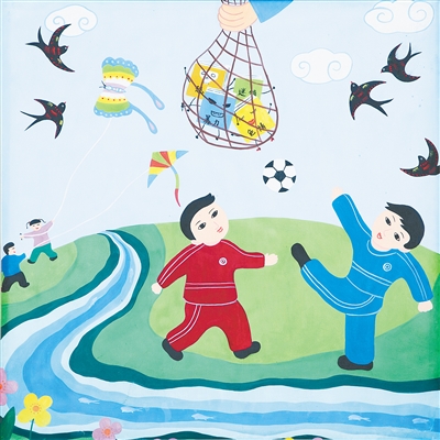 (記者 尹曉玉)藍(lán)天白云下,幾名孩子在歡樂地踢足球、放風(fēng)箏,畫面和諧美好。在孩子們的頭頂,一雙大手將色情、迷信、暴力書籍收入網(wǎng)中……這是舞陽農(nóng)民畫家梁素平的“護(hù)苗”主題作品《收網(wǎng)》。近日,44幅以“護(hù)苗”為主題的舞陽農(nóng)民畫,在中宣部辦公區(qū)一樓大廳展出。這些作品色彩艷麗、寓意深刻,既有鮮明的時(shí)代特點(diǎn)和豐富的文化內(nèi)涵,又使“掃黃打非”宣傳工作有了更生動、更接地氣的表達(dá)。