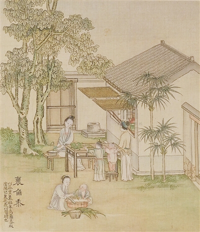 【清】徐揚《端陽故事圖冊》之“裹角黍”
