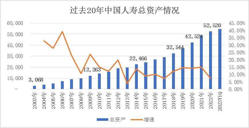 保費規(guī)模的增長,也帶動著公司的資產(chǎn)規(guī)模迅速增長。經(jīng)過20年的積累,國壽壽險2022年的總資產(chǎn)規(guī)模達到了5.25萬億元,成為我國首家資產(chǎn)規(guī)模突破5萬億的壽險公司,較2003年上市之初的3287億元增長了15倍。