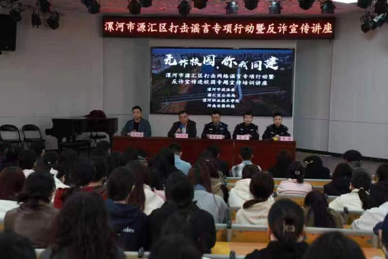 (通訊員:趙予曉)為深入推進打擊整治網(wǎng)絡(luò)謠言專項行動,有效提升廣大群眾對網(wǎng)上虛假信息的鑒別、識別能力和增強我轄區(qū)師生安全防范意識,筑牢網(wǎng)絡(luò)安全防線,提高反詐騙應(yīng)對能力。3月14日下午,漯河市公安局源匯分局聯(lián)合漯河市職業(yè)技術(shù)學(xué)院開展打擊網(wǎng)絡(luò)謠言專項行動暨反詐宣傳進校園專題宣傳培訓(xùn)講座。學(xué)校師生300余人參加本次講座。