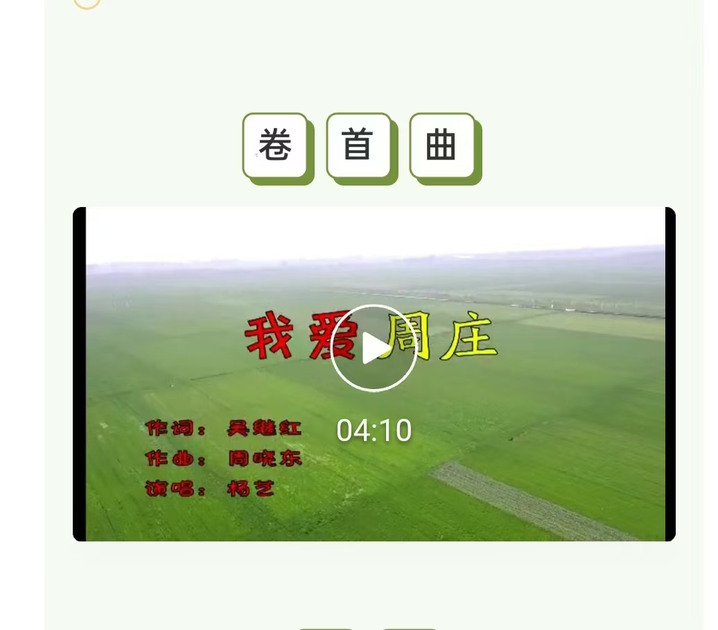 歌曲《我愛(ài)周莊》詞作者源匯區(qū)文化館吳繼紅,曲作者是原市音樂(lè)家協(xié)會(huì)主席周曉東,演唱者源匯區(qū)實(shí)驗(yàn)學(xué)校音樂(lè)老師楊藝。歌曲融入鄉(xiāng)村特色,運(yùn)用了中國(guó)民族調(diào)式,將周莊村的秀美風(fēng)光、村民勤勞勇敢的精神風(fēng)貌充分展現(xiàn)。歌詞富有詩(shī)意、旋律優(yōu)美,唱出了周莊村鄉(xiāng)村振興的美麗樂(lè)章,唱出了老百姓對(duì)當(dāng)下生活的滿足和對(duì)美好未來(lái)的期待,更唱響了周莊人的自豪感,凝聚了鄉(xiāng)情,成為鄉(xiāng)村文化的新符號(hào)。