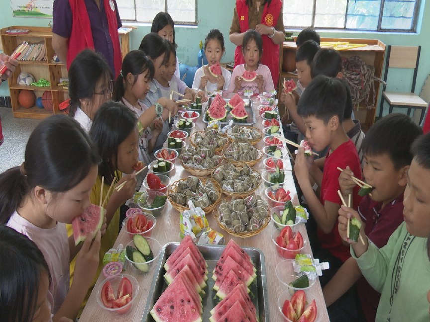 在三家店鎮(zhèn)高宗寨村兒童之家,鎮(zhèn)村干部們一早便忙活開來。他們精心準備了粽子、果凍,將鎮(zhèn)內(nèi)特色農(nóng)產(chǎn)品西紅柿、黃瓜、西瓜洗凈切片,撒上白糖,制成飽含愛意的美食?;顒蝇F(xiàn)場,孩子們圍坐在一起,伴隨著稚嫩的童聲合唱《小星星》,品嘗著酸甜可口的西紅柿、清爽多汁的果蔬拼盤和軟糯香甜的粽子,歡聲笑語此起彼伏。"太好吃啦!紅紅的西紅柿、圓圓的大西瓜、脆脆的黃瓜,還有甜甜的粽子,比我以前吃過的都好吃!我太喜歡了",高宗寨小學學生宋夢凡開心地分享著感受。鎮(zhèn)村干部們一邊與孩子們品嘗美食,一邊親切詢問學習生活情況,用實際行動傳遞溫暖關(guān)懷。